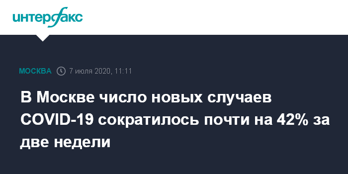 Москва. 7 июля. INTERFAX.RU - Число новых случаев COVID-19 в Москве неделю держится на низком уровне - около 600 случаев в сутки, за две недели число новых случаев сократилось на 41,8%, сообщили "Интерфаксу" во вторник в столичном оперативном штабе по контролю и мониторингу ситуации с коронавирусом.