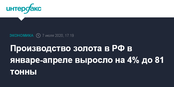 Москва. 7 июля. INTERFAX.RU - Производство золота в России в январе-апреле 2020 года составило 81,27 тонны, сообщил Минфин со ссылкой на данные о поставках сырья на российские аффинажные заводы.