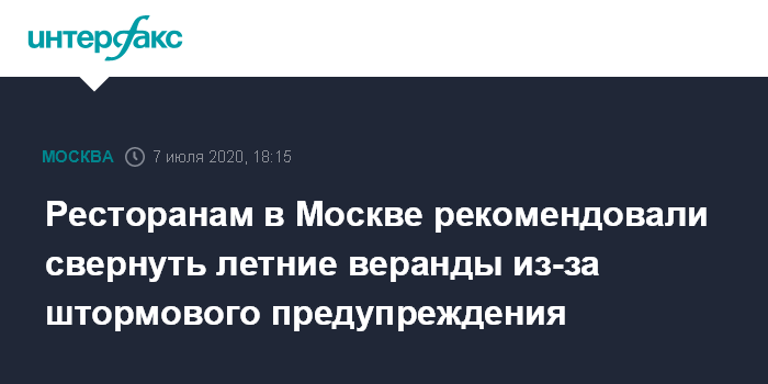 "В связи с тем, что в Москве в ближайшие часы ожидается дождь, местами сильный, гроза и усиление ветра до 20 м/с, просим все предприятия общественного питания, имеющие летние веранды, своевременно принять меры по прекращению их эксплуатации", - сообщили "Интерфаксу" в пресс-службе департамента во вторник.