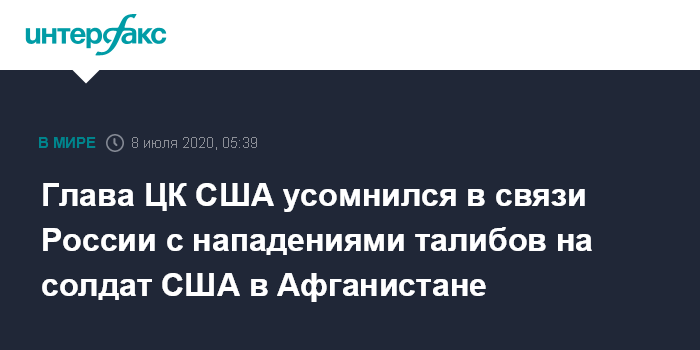 Москва. 8 июля. INTERFAX.RU - Глава Центрального командования США, генерал Фрэнк Маккензи считает сомнительной информацию о приписываемой России причастности к нападениям талибов (движение "Талибан" запрещено в РФ как террористическая организация,) на американских военных.