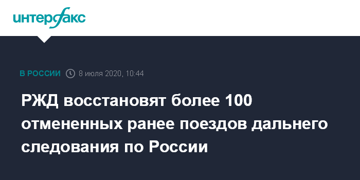 "С учетом ранее принятых решений курсирование возобновят (или увеличат периодичность) более 160 поездов, в том числе все скоростные поезда ("Сапсан", "Стриж" и "Ласточка"). На данном этапе восстановления графика движения планируется курсирование более 350 пар пассажирских поездов холдинга РЖД (включая круглогодичные и сезонные поезда), или 2/3 от объемов, предусмотренных графиком движения поездов дальнего следования на 2020 год", - отмечает компания.
