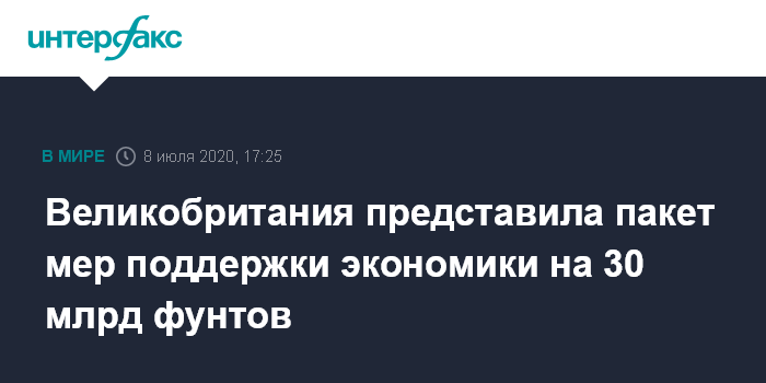 Москва. 8 июля. INTERFAX.RU - Правительство Великобритании представило новый план поддержки экономики в условиях кризиса, вызванного пандемией коронавируса, предусматривающий стимулирующие меры общим объемом порядка 30 млрд фунтов стерлингов ($37,6 млрд).
