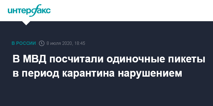"Нам разъяснили в центральном аппарате МВД, что сейчас продолжаются карантинные меры, поэтому по статье 20.2 КоАП РФ люди нарушают эти меры, если выходят в одиночные пикеты и заслуживают наказания в виде штрафа в размере от 10 до 20 тысяч рублей", - сказал Соловьев в среду.