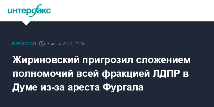 Москва. 9 июля. INTERFAX.RU - Фракция ЛДПР в Госдуме может сложить полномочия в знак протеста против ареста губернатора Хабаровского края Сергея Фургала, заявил лидер партии Владимир Жириновский в четверг.