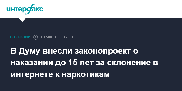Москва. 9 июля. INTERFAX.RU - В Госдуму внесен законопроект, предусматривающий наказание от 12 до 15 лет лишения свободы за склонение к потреблению наркотиков через интернет, если эти действия повлеки смерть двух и более человек. Об этом сообщил глава комитета Госдумы по безопасности и борьбе с коррупцией Василий Пискарев.