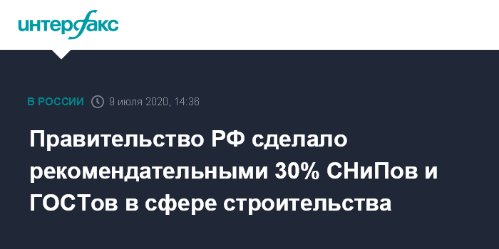 Москва. 9 июля. INTERFAX.RU - Премьер-министр России Михаил Мишустин сообщил, что подписал постановление, согласно которому порядка трети ГОСТов, СНиПов и других обязательных требований становятся рекомендательными.