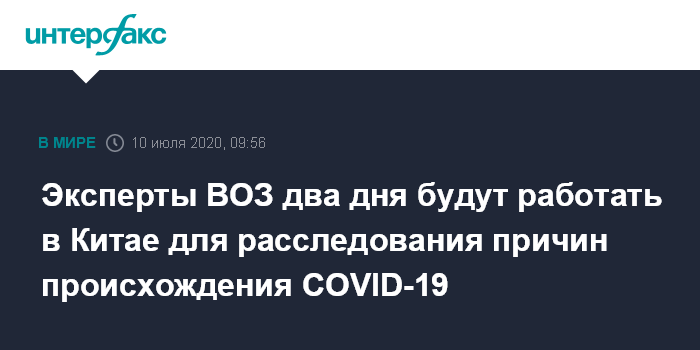 Москва. 10 июля. INTERFAX.RU - Двое специалистов Всемирной организации здравоохранения (ВОЗ) будут в течение ближайших двух дней находиться в Пекине в рамках расследования причин появления коронавируса COVID-19, сообщает агентство Associated Press.