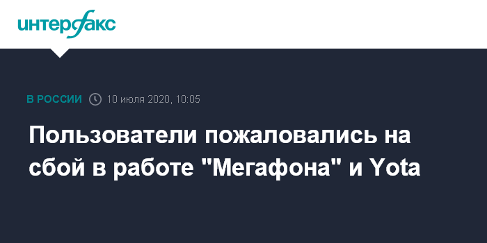 Москва. 10 июля. INTERFAX.RU - Пользователи жалуются на масштабный сбой в работе сети операторов ПАО "Мегафон" и Yota (работает на сети "Мегафона" по модели виртуального оператора связи), следует из сообщений в соцсетях и данных сервиса Downdetector.