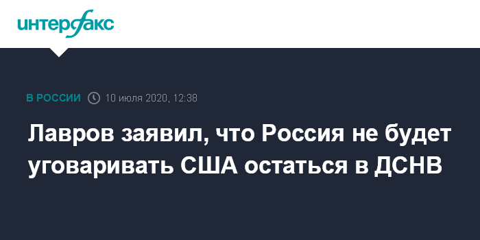 Москва. 10 июля. INTERFAX.RU - Россия гарантировано сможет обеспечить свою безопасность в случае непродления Договора об СНВ, уговаривать США остаться в Договоре не будет, заявил в пятницу глава МИД РФ Сергей Лавров.