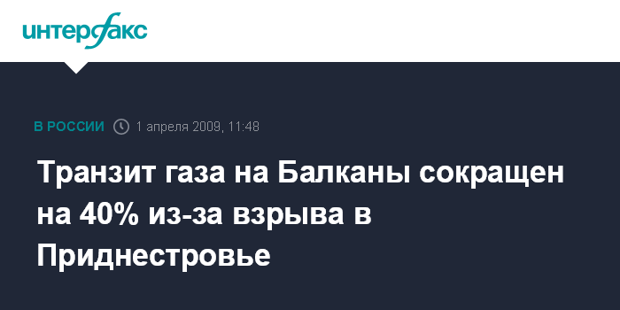 Москва. 1 апреля. INTERFAX.RU - Транзит природного газа в балканские страны продолжается, однако в уменьшенных объемах из-за взрыва одного из газопроводов в Приднестровье, сообщил агентству "Интерфакс-Украина" глава пресс-центра Национальной акционерной компании "Нафтогаз Украины" Валентин Землянский.