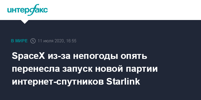 Москва. 11 июля. INTERFAX.RU - Компания SpaceX перенесла запланированный на субботу запуск на орбиту ракеты-носителя Falcon 9 с очередной партией из 57 мини-спутников для продолжения развертывания глобальной сети интернет-покрытия системы Starlink, сообщил Космический центр имени Кеннеди.