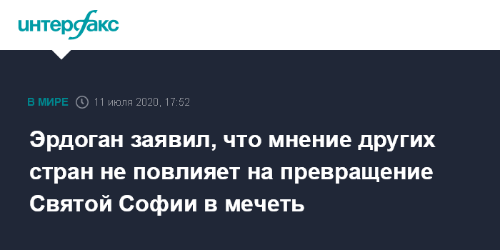 Москва. 11 июля. INTERFAX.RU - Президент Турции Реджеп Тайип Эрдоган заявил в субботу, что Анкара не ориентируется на мнение других государств в вопросе смены статуса комплекса Святая София и превращения его в действующую мечеть, сообщает "Анадолу".