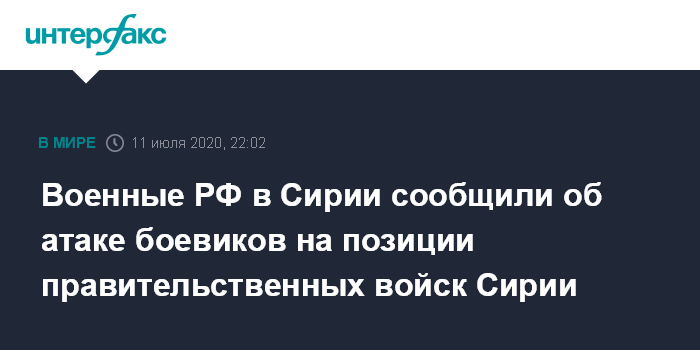 Москва. 11 июля. INTERFAX.RU - Российские военные в Сирии сообщили об атаке двух отрядов боевиков на позиции сирийских правительственных войск в провинции Идлиб.