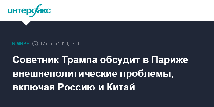 Москва. 12 июля. INTERFAX.RU - Советник президента США по национальной безопасности Роберт О'Брайен в понедельник, 13 июля, отбывает в Париж, чтобы обсудить с европейскими партнерами ряд внешнеполитических проблем, сообщил журналистам представитель Совета национальной безопасности Белого дома Джон Уллиот.