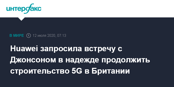 Москва. 12 июля. INTERFAX.RU - Китайская телекоммуникационная компания Huawei Technologies обратилась с просьбой о встрече с премьер-министром Великобритании Борисом Джонсоном, чтобы попытаться договориться об отсрочке ее возможного отстранения от строительства сети 5G, сообщила в воскресенье газета Sunday Times.