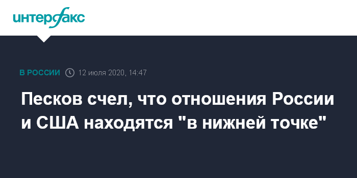 Москва. 12 июля. INTERFAX.RU - Состояние отношений России и США из рук вон плохое как и в двустороннем плане, так и в плане ответственности за многосторонние документы, связанные с контролем над вооружениями и стратегической стабильности, заявил пресс-секретарь президента РФ Дмитрий Песков.