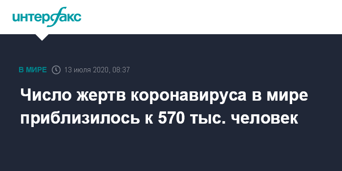 Москва. 13 июля. INTERFAX.RU - Число скончавшихся от связанных с коронавирусом заболеваний в мире достигло 569 128 человек, увеличившись за сутки на 4 620, сообщил в понедельник американский университет Джонса Хопкинса.