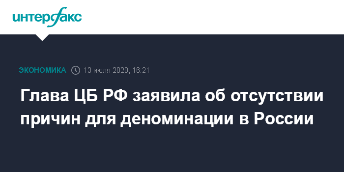 Москва. 13 июля. INTERFAX.RU - Обсуждение темы денежной реформы в РФ возникло на пустом месте: никаких причин для таких шагов нет, заявила председатель Банка России Эльвира Набиуллина на заседании совета по развитию финансового рынка при Совете Федерации.