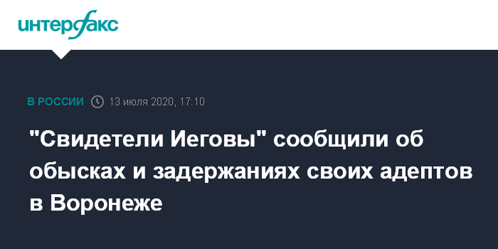 Москва. 13 июля. INTERFAX.RU - Обыски проходят у последователей религиозной ячейки "Свидетелей Иеговы" (организация, запрещенная на территории РФ) в Воронеже, сообщается на сайте организации.