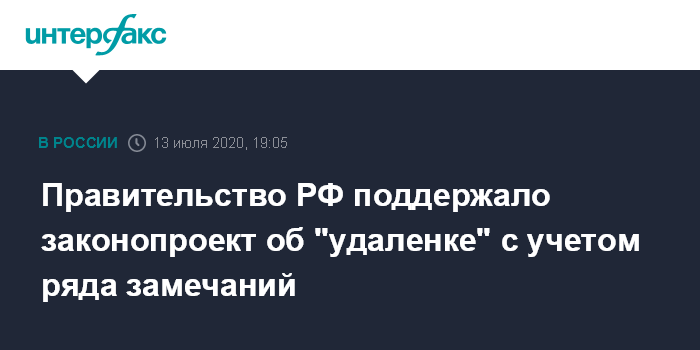 Москва. 13 июля. INTERFAX.RU - Кабинет министров РФ поддерживает законопроект об удаленной работе, говорится в проекте отзыва правительства на законодательную инициативу о новых режимах работы и их регулировании.