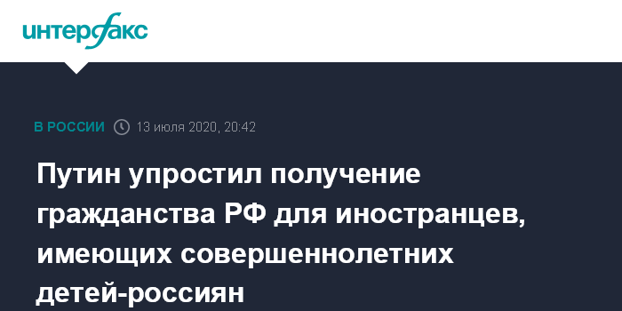 Москва. 13 июля. INTERFAX.RU - Президент РФ Владимир Путин подписал закон о праве на упрощенную процедуру получения гражданства РФ для иностранцев, имеющих совершеннолетних детей-россиян. Документ опубликован на официальном портале правовой информации.