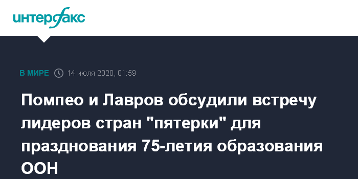 "Госсекретарь Помпео и министр иностранных дел Лавров обсудили вопрос о созыве в ближайшее время лидеров стран "пятерки" для празднования 75-й годовщины основания Организации Объединенных Наций", - говорится в сообщении, распространенном госдепом.