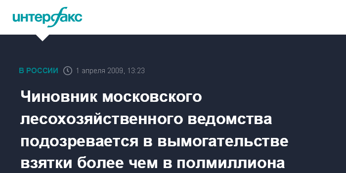 Москва. 1 апреля. INTERFAX.RU - Замглавы управления лесного хозяйства по Москве и Московской области задержан по подозрению в вымогательстве взятки.