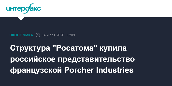 Москва. 14 июля. INTERFAX.RU - Входящий в "Росатом" производитель углеродного волокна UMATEX приобрел российское представительство французской Porcher Industries, специализирующейся на производстве технического текстиля. Сумма сделки не раскрывается.