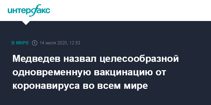 Москва. 14 июля. INTERFAX.RU - Вакцинацию от коронавируса будет разумно провести одновременно во всем мире, считает заместитель председателя Совета безопасности Дмитрий Медведев. Он сказал это на круглом столе по сотрудничестве в сфере безопасности в условиях пандемии.