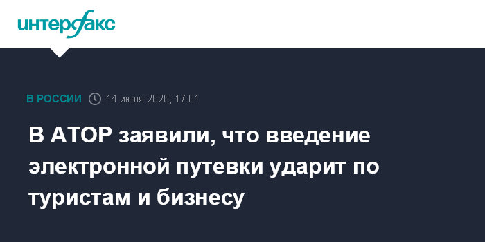 Москва. 14 июля. INTERFAX.RU - Введение системы электронной путевки увеличит финансовую нагрузку на туристов и туристический бизнес в условиях, когда отрасль и так очень сильно пострадала от пандемии коронавируса, считает исполнительный директор Ассоциации туроператоров России (АТОР) Майя Ломидзе.