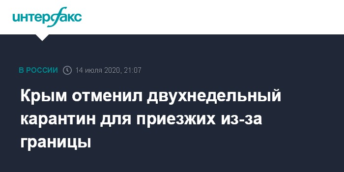 Москва. 14 июля. INTERFAX.RU - Власти Крыма отменяют со среды, 15 июля, обязательный 14-дневный карантин для приезжающих в республику из зарубежья.
