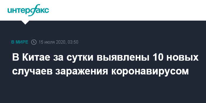 Москва. 15 июля. INTERFAX.RU - За истекшие сутки в Китае выявлены 10 новых случаев заражения коронавирусом, из них шесть больных в активной форме и четыре бессимптомных носителя, сообщил Госкомздрав КНР на своем официальном сайте.