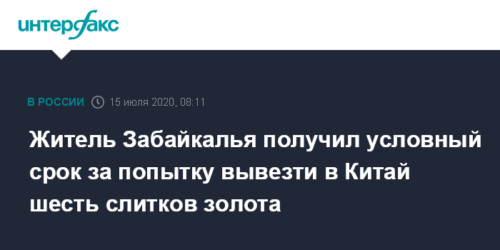 Москва. 15 июля. INTERFAX.RU - Житель Забайкалья приговорен к трем годам и четырем месяцам лишения свободы условно за попытку вывезти за границу незаконно добытое золото в шести слитках, сообщили в краевом пограничном управлении ФСБ. Его также оштрафовали на 10 000 рублей.