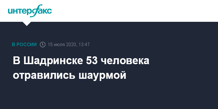 Москва. 15 июля. INTERFAX.RU - В Шадринске число отравившихся шаурмой выросло до 53, сообщила пресс-секретарь управления Роспотребнадзора Курганской области Светлана Химко. Днем ранее сообщалось о 28 пострадавших.
