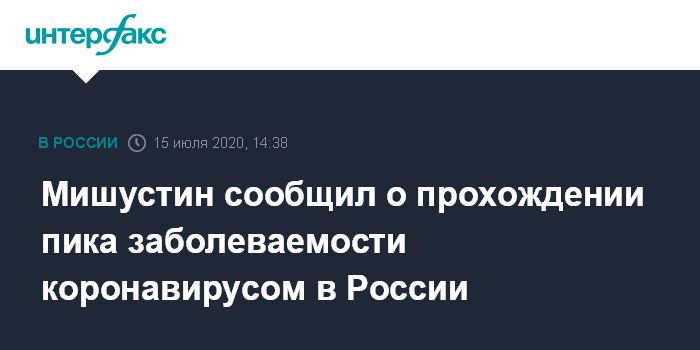 Москва. 15 июля. INTERFAX.RU - Россия прошла пик заболеваемости коронавирусом, и сейчас наблюдается улучшение ситуации, заявил премьер-министр РФ Михаил Мишустин.