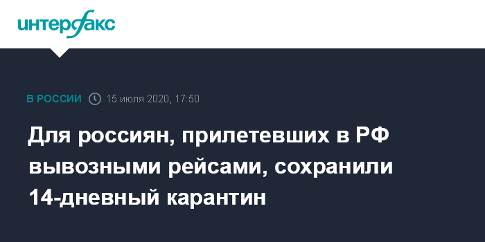 Москва. 15 июля. INTERFAX.RU - Роспотребнадзор сохраняет 14-дневный режим самоизоляции по прибытию в Россию для граждан, которые прилетели в страну вывозными рейсами.