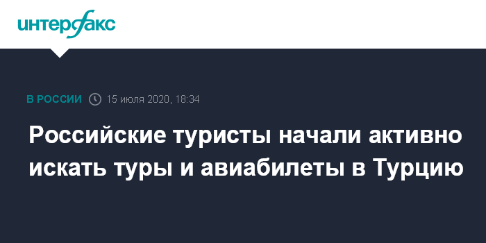 Москва. 15 июля. INTERFAX.RU - Российские туристы быстро отреагировали на сообщение о возможном возобновлении рейсов в Турцию в ближайшее время и начали активно интересоваться пакетными турами в агентствах и искать авиабилеты на онлайн-сервисах.