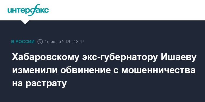 Москва. 15 июля. INTERFAX.RU - Следствие по делу экс-губернатора Хабаровского края, бывшего вице-президента нефтяной компании "Роснефть" Виктора Ишаева, обвиняемого в растрате 7,5 млн рублей, завершено. Обвинение переквалифицировано с мошенничества на растрату, сообщила официальный представитель Следственного комитета (СК) Светлана Петренко.