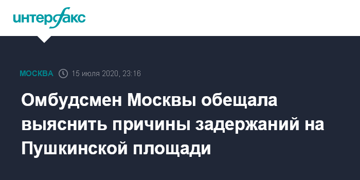 Москва. 15 июля. INTERFAX.RU - Уполномоченный по правам человека в Москве Татьяна Потяева заявила, что обратится в правоохранительные органы для выяснения причин задержания участников несанкционированной акции против внесения поправок в Конституцию на Пушкинской площади.