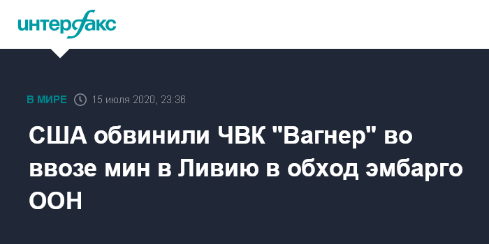 Москва. 15 июля. INTERFAX.RU - Воюющие на стороне сил Халифы Хафтара бойцы ЧВК "Вагнер" нарушили эмбарго ООН на поставку оружия в Ливию, привезя и установив в этой стране противопехотные мины и самодельные взрывные устройства, заявили в среду в Африканском командовании ВС США.