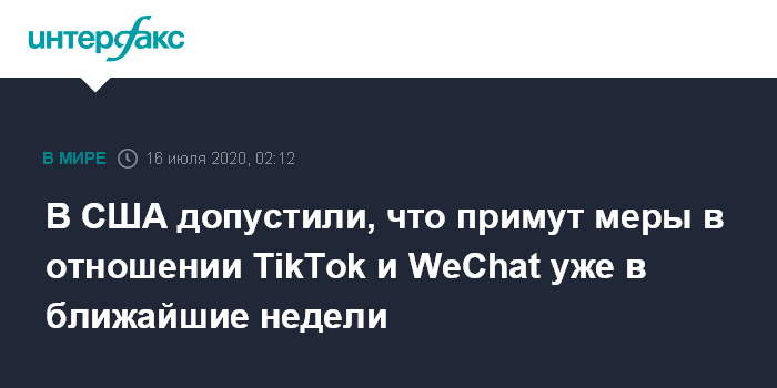 Москва. 16 июля. INTERFAX.RU - Глава аппарата Белого дома Марк Медоуз заявил, что администрация рассматривает ряд действий в отношении китайских приложений TikTok, WeChat и других, который могут быть предприняты уже в ближайшие недели.
