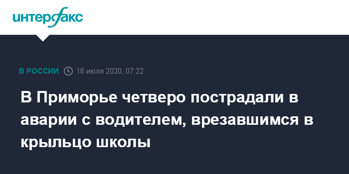 Москва. 16 июля. INTERFAX.RU - Четыре человека в Приморье пострадали в результате аварии с участием пьяного водителя, врезавшегося в крыльцо школы, сообщила в четверг пресс-служба краевого УМВД.