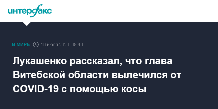 Москва. 16 июля. INTERFAX.RU - Президент Белоруссии Александр Лукашенко рассказал о способе, который помог губернатору Витебской области Николаю Шерстневу вылечиться от коронавируса.