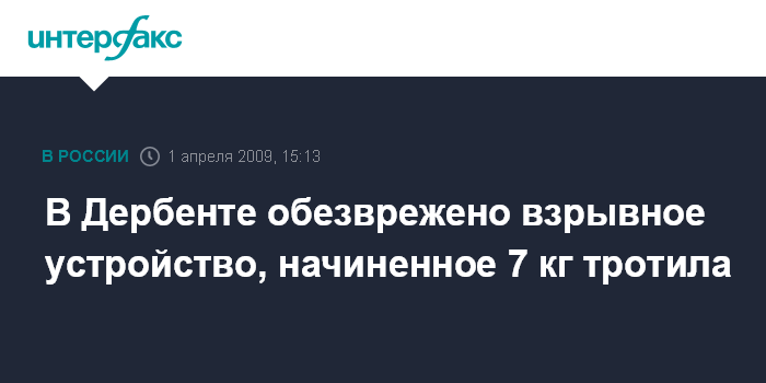 Махачкала. 1 апреля. INTERFAX.RU - Мощное взрывное устройство обнаружено и обезврежено в среду в дагестанском городе Дербент, сообщили "Интерфаксу" в группе общественных связей (ГОС) УФСБ России по Дагестану.