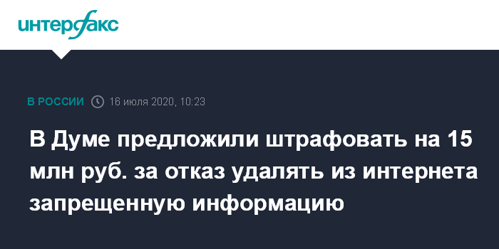 Москва. 16 июля. INTERFAX.RU - В Госдуму в четверг внесен законопроект, предусматривающий серьезные штрафные санкции за не предпринятые провайдерами и владельцами сайтов меры по ограничению доступа и удалению информации, распространение которой в РФ запрещено; согласно законопроекту, штрафы за такие нарушения могут доходить до 15 млн рублей.