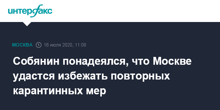 Москва. 16 июля. INTERFAX.RU - Мэр Москвы Сергей Собянин считает, что в городе удастся избежать введения повторных ограничительных мер в связи с распространением коронавируса.