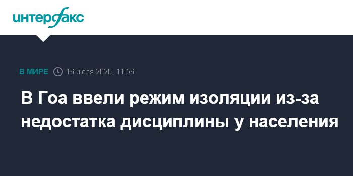 Москва. 16 июля. INTERFAX.RU - Власти штата Гоа в Индии с четверга вводят трехдневный режим изоляции по причине массового нежелания жителей соблюдать меры предосторожности в связи с пандемией коронавируса, сообщают западные СМИ.