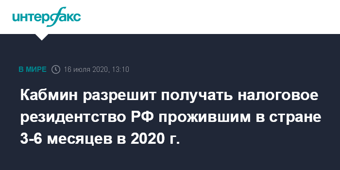 Москва. 16 июля. INTERFAX.RU - Правительство РФ поддержало поправки в Налоговый кодекс, позволяющие в 2020 году присваивать статус российского налогового резидента физическим лицам, которые провели в стране в текущем году от трех месяцев до полугода.