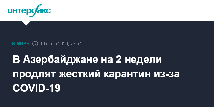 Москва. 16 июля. INTERFAX.RU - Власти Азербайджана планируют продлить жесткий карантин из-за коронавируса COVID-19 еще на две недели, заявил помощник президента - заведующий отделом по экономическим вопросам и политике инновативного развития Шахмар Мовсумов.