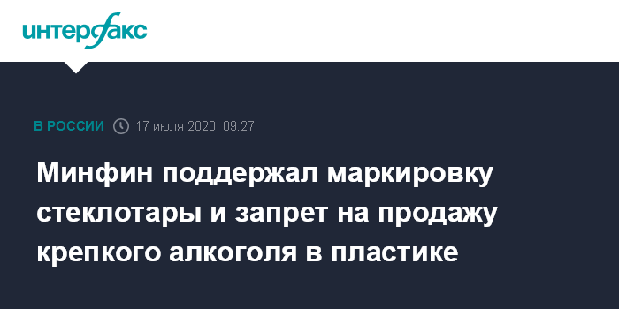 Москва. 17 июля. INTERFAX.RU - Минфин поддержал инициативу сенаторов о введении в РФ запрета на производство и оборот алкогольной продукции крепостью выше 28 градусов в любой пластиковой таре, кроме того, он поддержал идею введения обязательной маркировки стеклотары.
